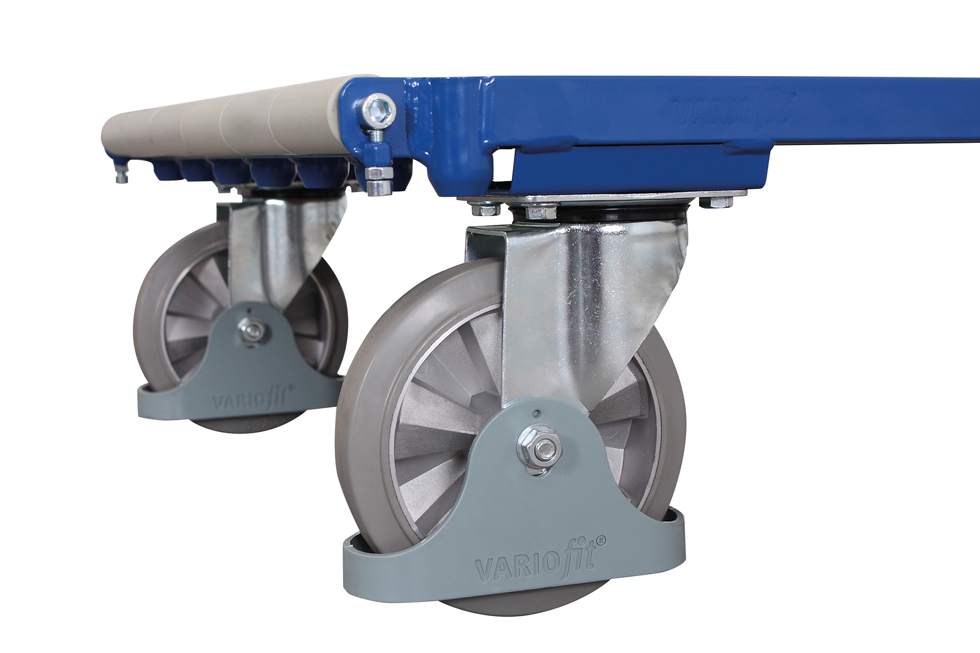 Elastic solid-rubber tyres, grey on cast aluminium wheel rim with precision deepgroove ball bearings Thread guard and foot guard 2 swivel castors and 2 fixed castors with central foot brake EasySTOP (1 swivel and 1 fixed castor is braked on one longitudinal side).