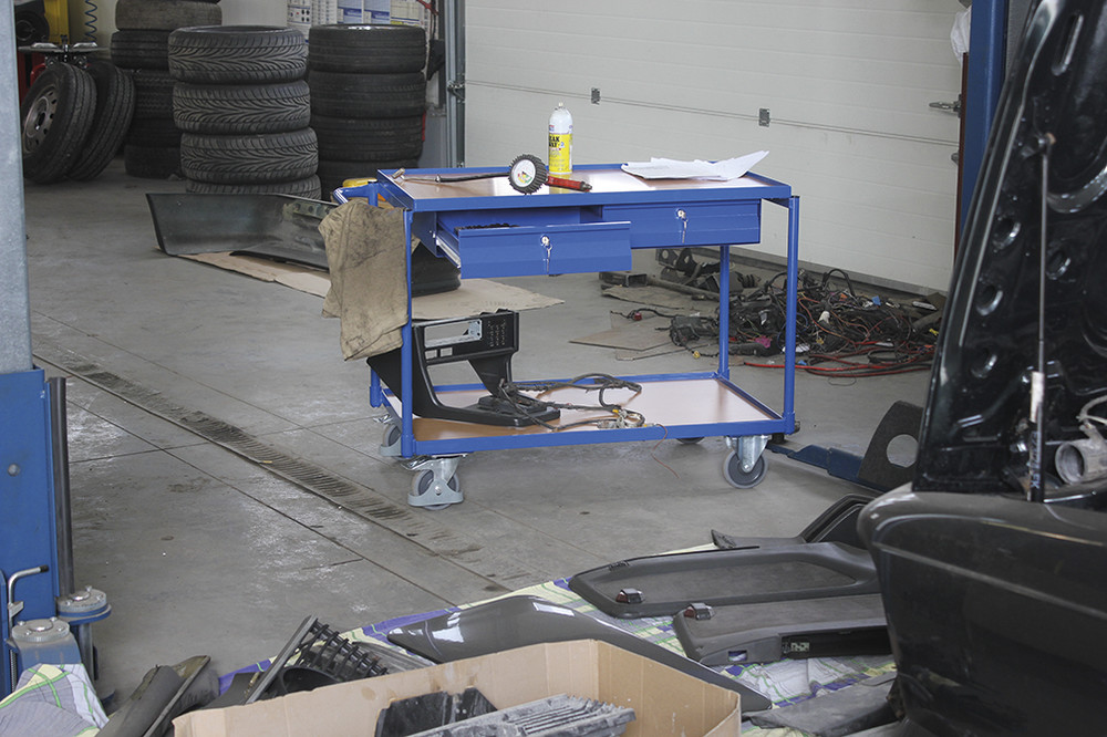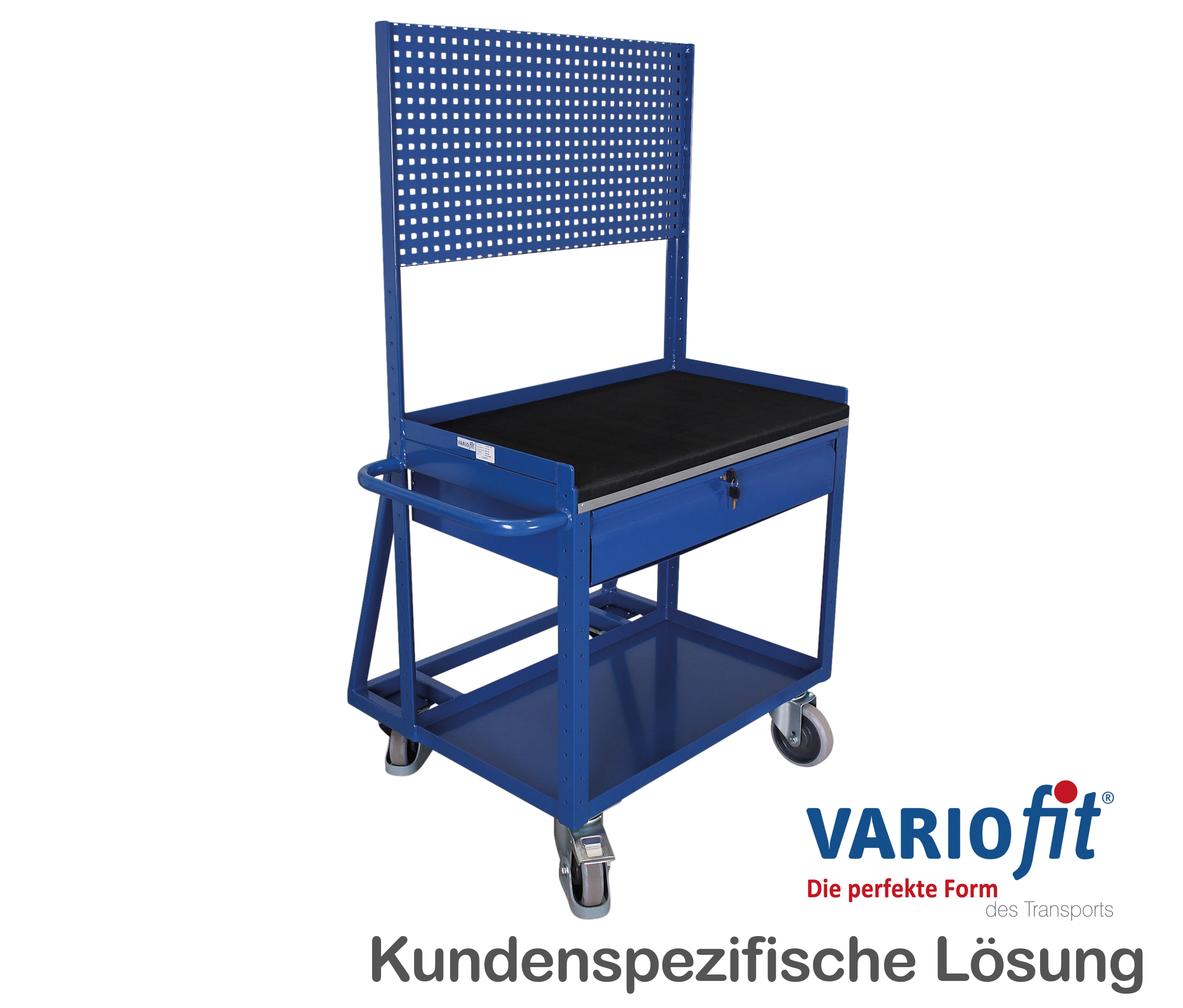 Schweißkonstruktion aus Stahl Bodenkonstruktion mit dem innovativen L-Profil Arbeitsplatte aus Buchensperrholz dreiseitiger Rand 80 mm hoch Arbeitshöhe: 850 mm Boden aus Winkelstahl Ladefläche aus Holzwerkstoffplatte mit Rand = 12 mm hoch Wagen dauerhaft oberflächengeschützt schlag- und kratzfest Flügeltürschrank mit Grundboden und 2 variablen Schrankböden Traglast pro Schrankboden 30 kg Schublade mit Gleitführung abschließbar mittels Zylinderschloss (Wagen in sich gleichschließend) Traglast pro Schublade 25 kg Bereifung aus thermoplastischem Gummi auf Kunststofffelge mit Präzisions-Rillenkugellager, grau, "spurlos" Faden- und Fußschutz 2 Lenkrollen mit EasySTOP und 2 Bockrollen.
