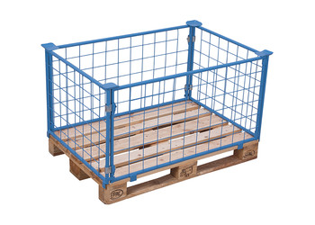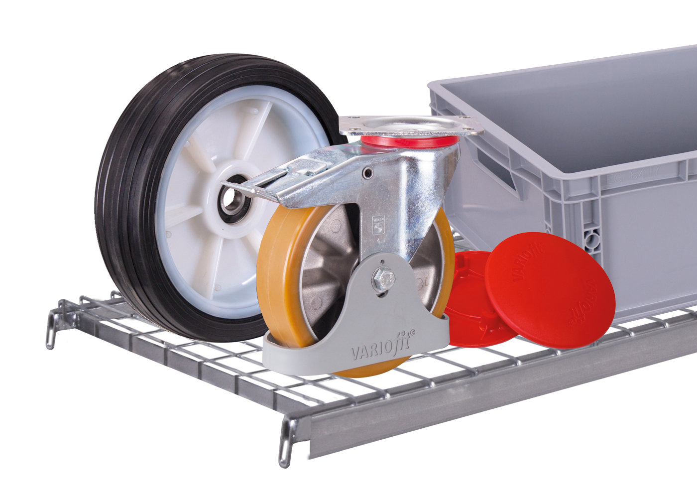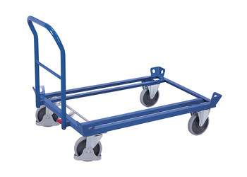 Welded steel construction With 4 pieces push-fit tubular steel stanchions, galvanised, length 610 mm Clear width between the stanchions: 625 mm Load surface of waterproof bonded plywood, surface finish screen printed Permanent surface protection Impact- and scratch-resistant Elastic solid-rubber tyres on cast aluminium wheel rim with precision deepgroove ball bearings with foot guard 4 swivel castors including 2 with wheel brake.