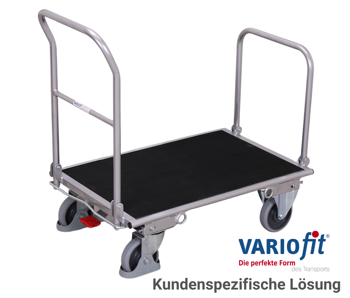 Construction très robuste, solidement mécano-soudé en tube d'acier avec la poignée repliable avec le système de freinage de parking poignée avec tube transversal accroche supplémentaire qui se trouve dessous poignée plateau mélaminé résistant aux chocs et aux rayures roues à bandage en caoutchouc thermoplastique gris anti-trace avec roulement à billes de précision protège-pieds et protection contre fibre 2 roulettes pivotantes avec frein de parking et 2 roulettes fixes.